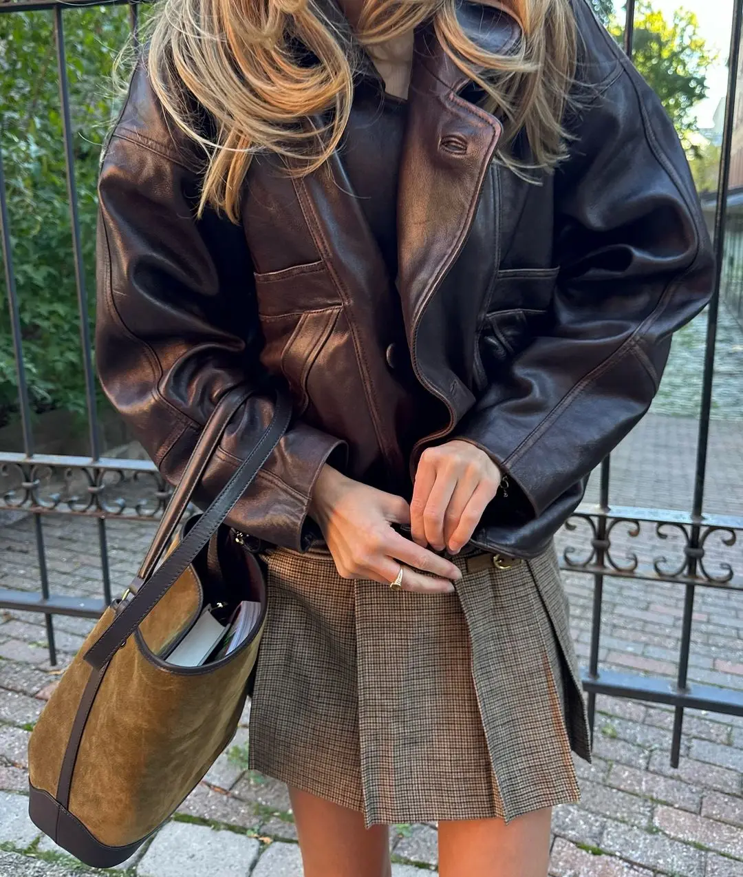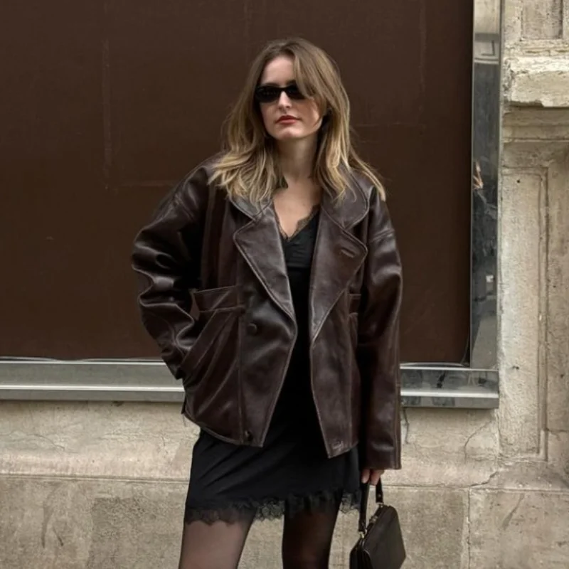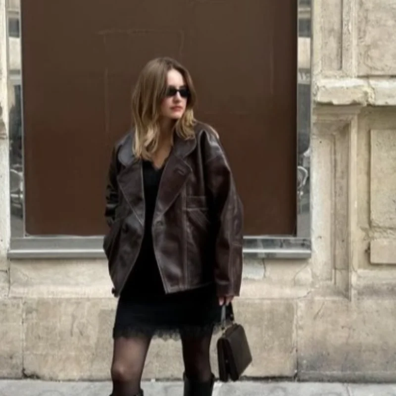 TAVIMART - Vintage Burgundy Oversized Leather Jackets For Women Fashion Single Breasted Pockets Lapel Coats Lady Y2k Streetwear Winter