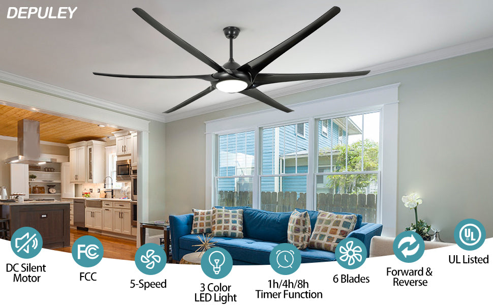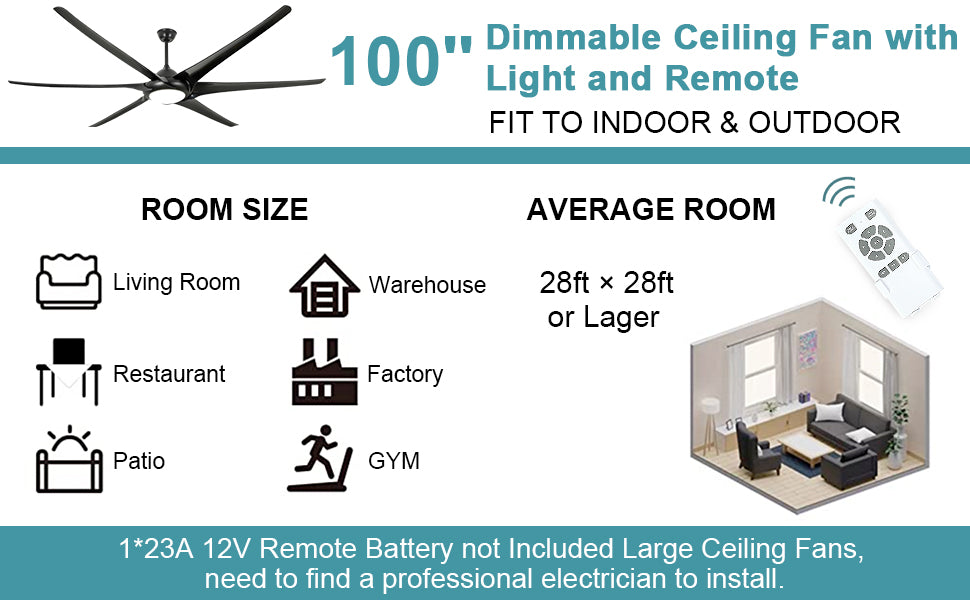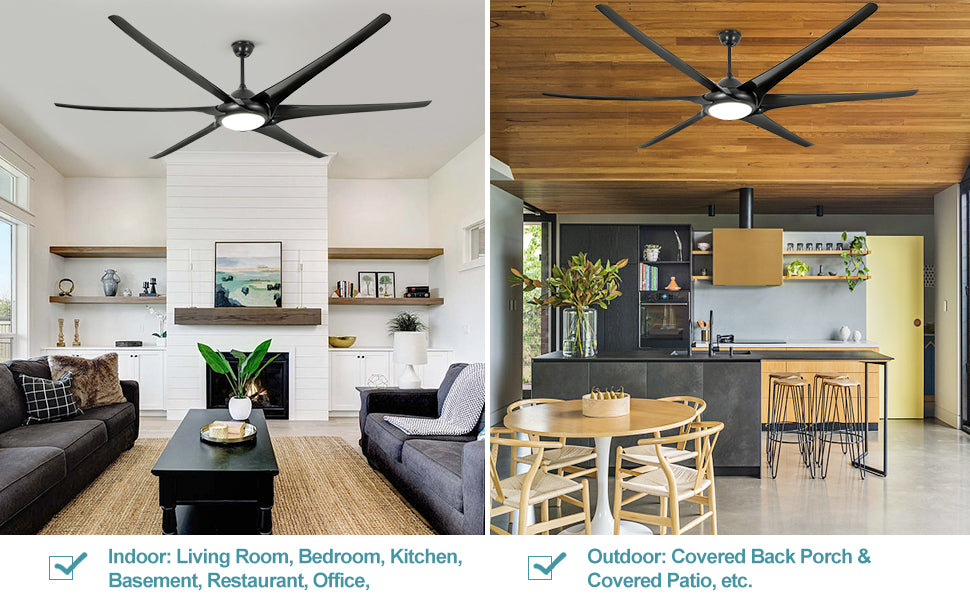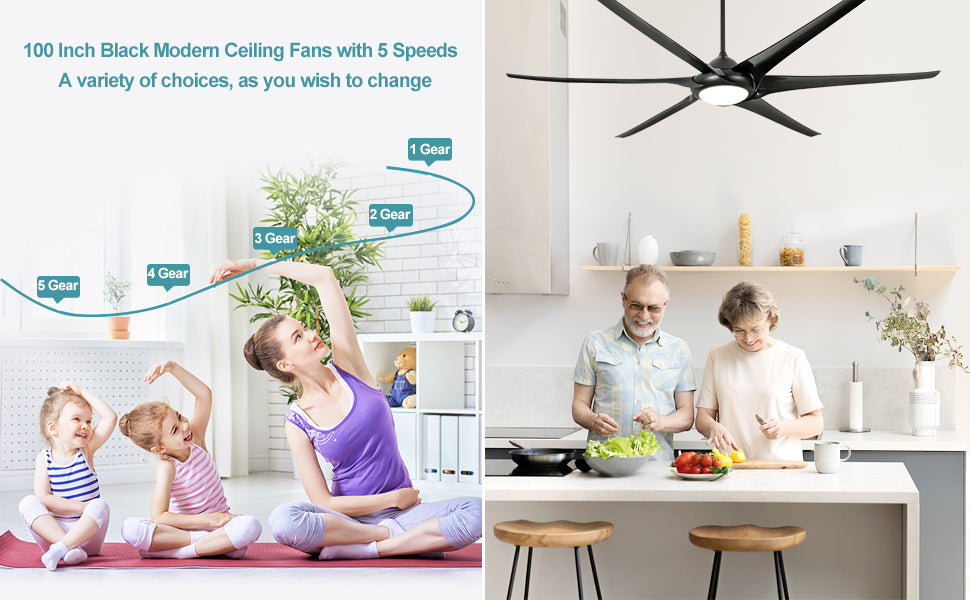 - 【100" Ceiling Fans】Our FCC-compliant 100-inch diameter ceiling fan comes with 5" and 10" down rods, black steel DC motor, 6 black blades, and high light-transmitting glass shade. Use it indoor/outdoor in living room, bedroom, office, kitchen, corridor, patio, restaurants, working area, gyms, etc.