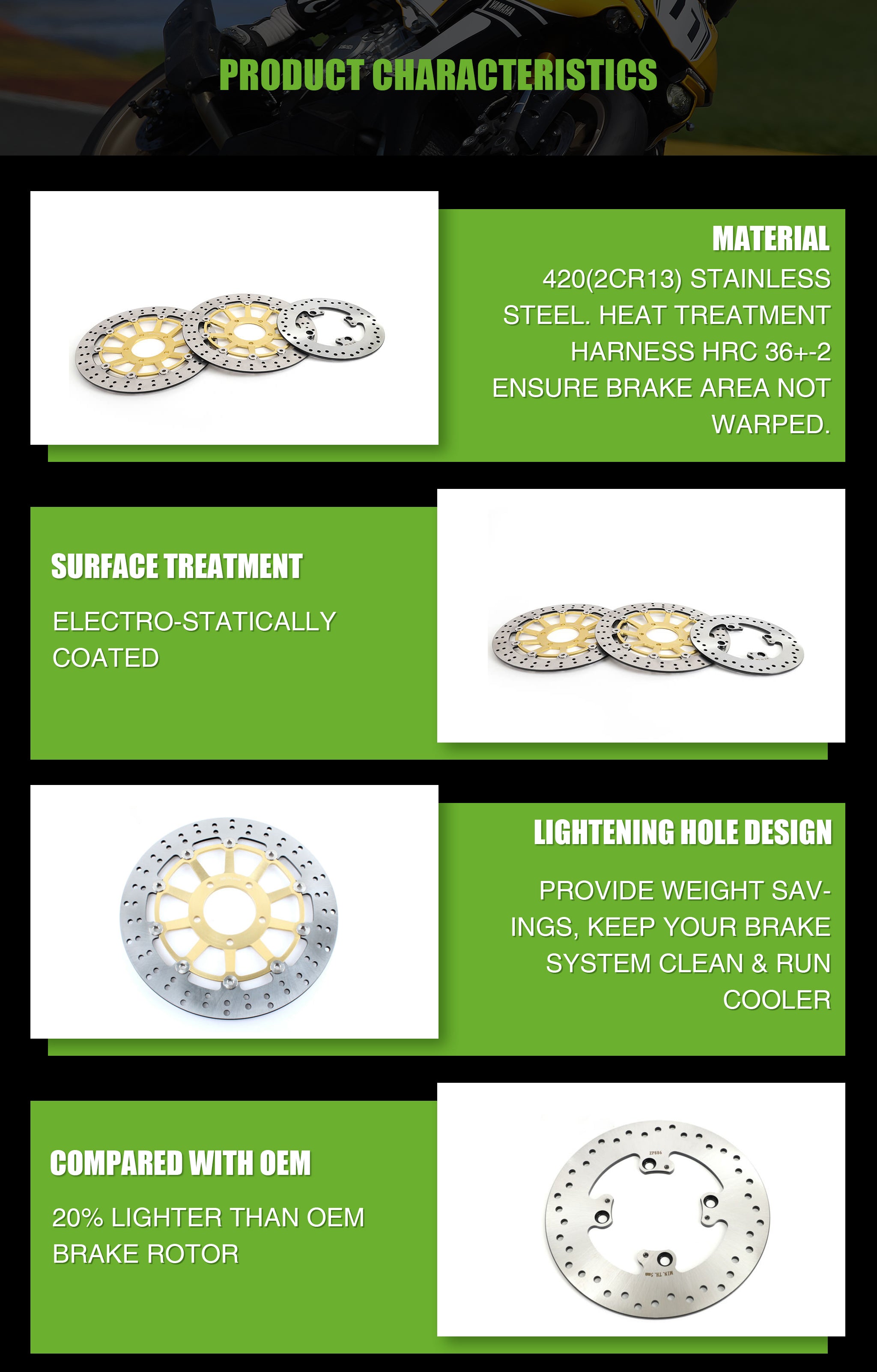 - Front floating disc made by stainless steel 420 (2Cr13) & aluminum alloy 6061. All are heat treatment and approved great performance.