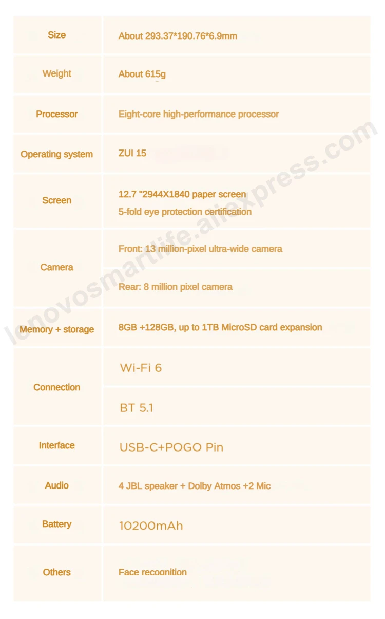 SPECIFICATIONSBrand Name: LenovoDisplay Size: 12.7"Feature: Dual CamerasCamera: Second WebcamSecond Webcam Pixels: 8MPHign-concerned Chemical: NoneTablet Storage Capacity: 128GBProcessor Model: othersOperating System: Android 13Origin: Mainland China