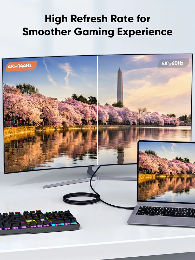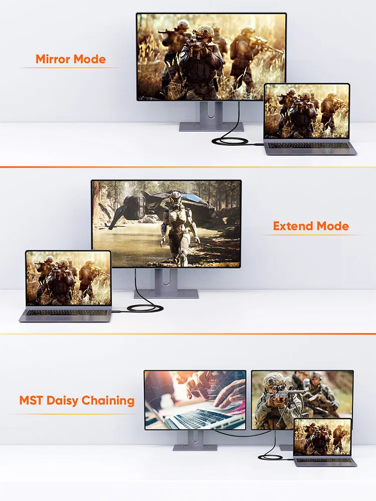 Display Port to USB C cable supports 8K Ultra HD video, downwards compatible with 5K@60Hz, 4K@144Hz, 2K@240Hz, 2K@165Hz and lower. When used with Mac devices the cable supports mirror or extend mode and when used with Windows devices it supports duplicate or extend mode. The USB-C to DisplayPort cord also supports MST daisy chaining