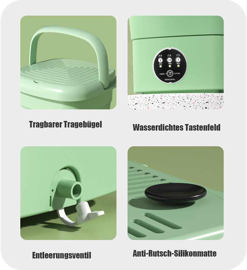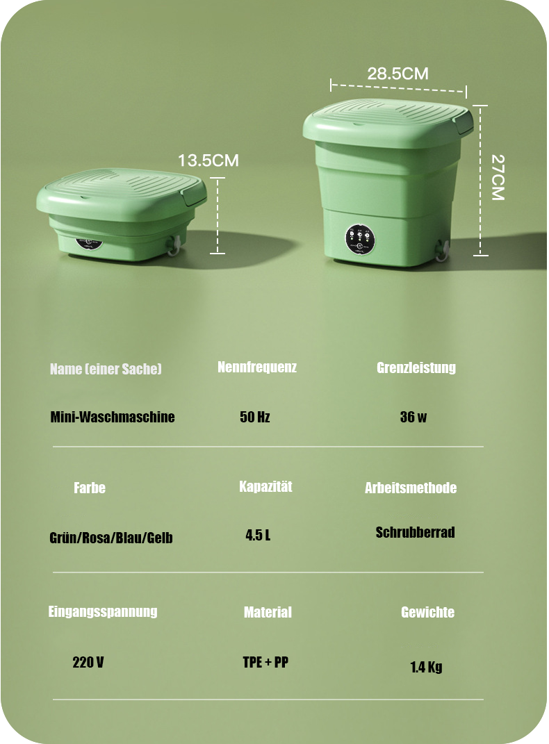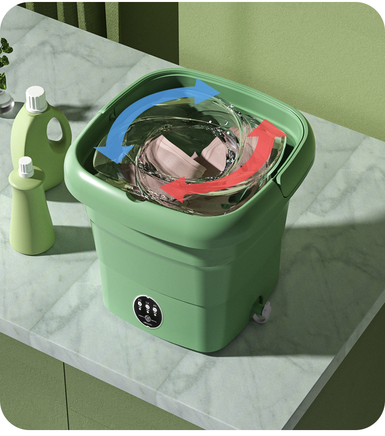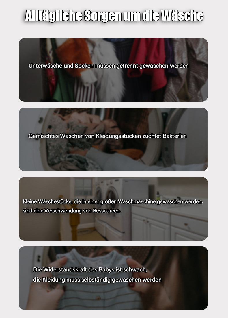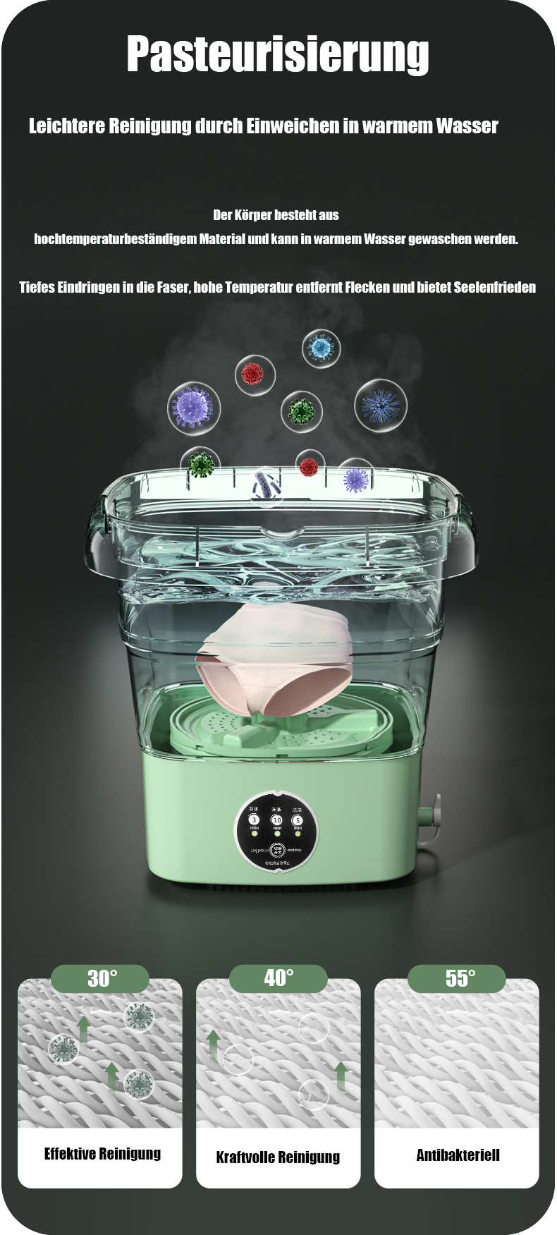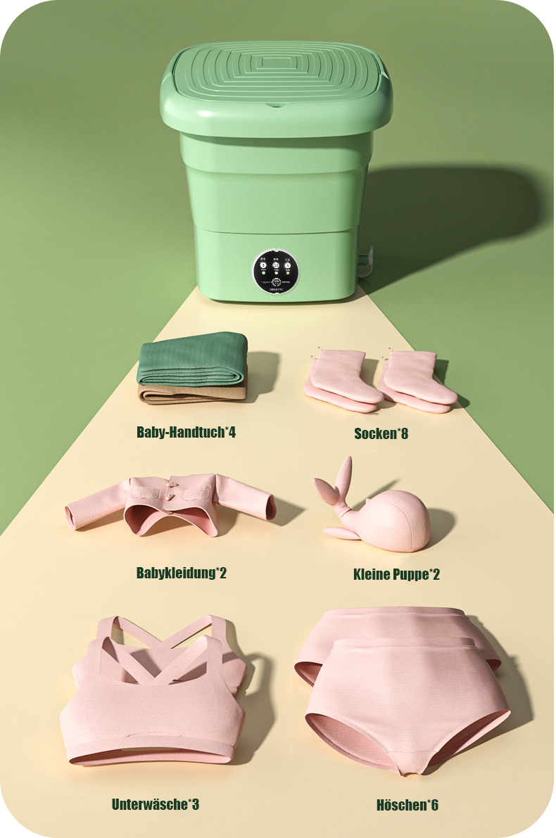 Tiefenreinigung: Trotz ihrer geringen Größe bietet die kompakte Waschmaschine auch eine Tiefenreinigung, die die Kleidung gründlich reinigt und Flecken und Bakterien durch eine effektive Waschwirkung und Wasserflussgestaltung entfernt.