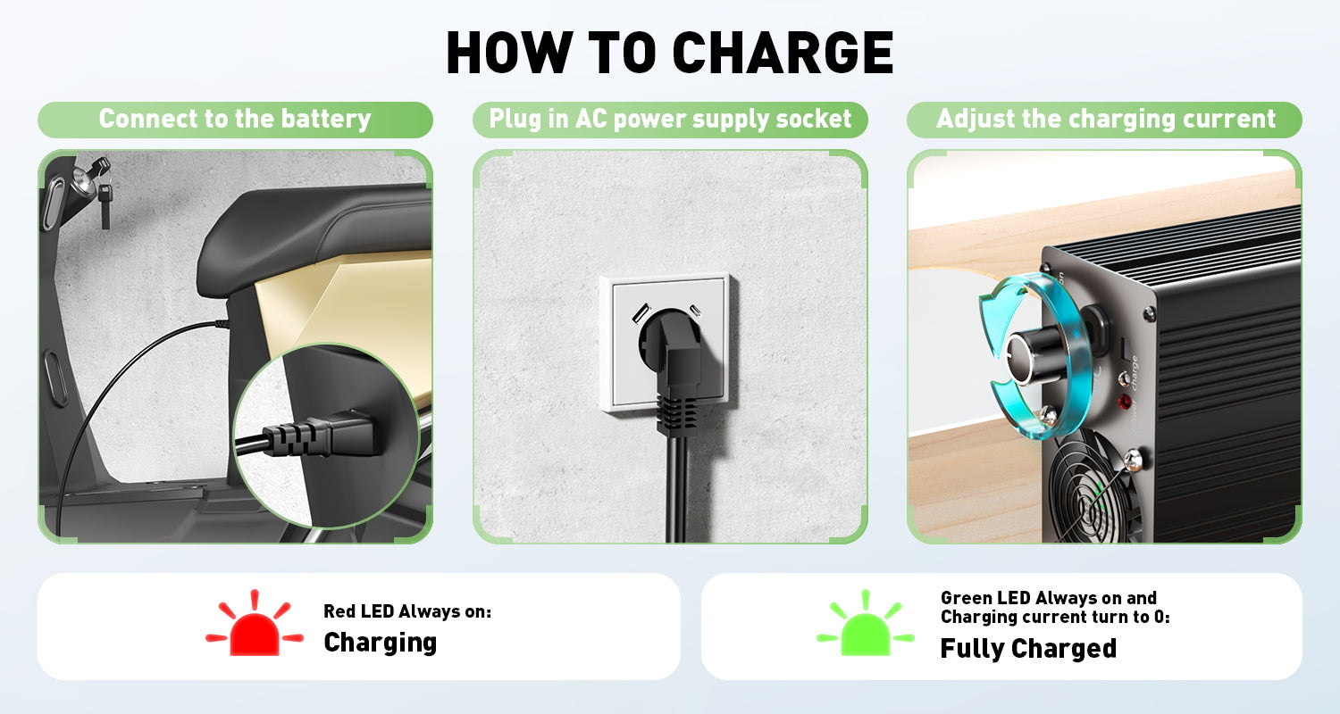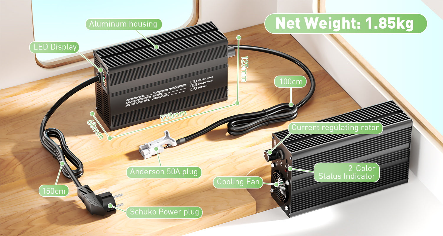 - Tipo di spina di carica opzionale: IEC C13 (spina 3P), XT60, XT90, Anderson 50 A, pinza a coccodrillo, M8, ecc. (Se la versione di cui hai bisogno non è elencata, contatta il nostro servizio clienti).
