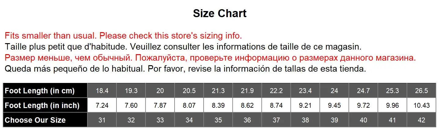 - Before buying, please check our size. We will have a size chart for each shoe. Please measure your foot size and find the size (Length of shoe/ cm) that suits you for purchase. After receiving the package, please ignore the size marked on the package. The size of the shoes is the size you purchased. If you are not sure, please contact us in time.