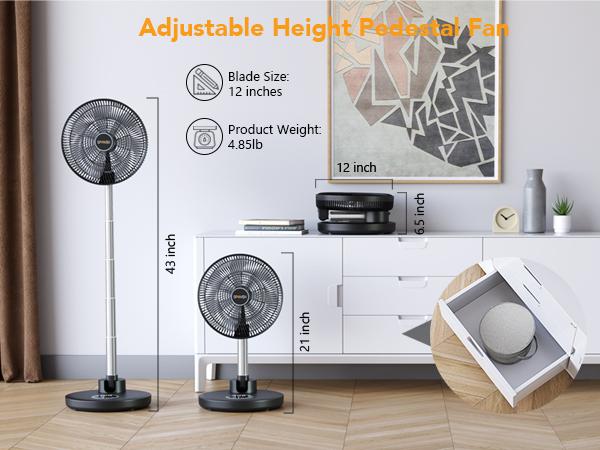 Stay cool wherever you go with the SPOVEN Oscillating Standing Fan 12” Pedestal Fan. This powerful fan is designed to provide a refreshing breeze in any room of your home, or even while you're on the go.Adjustable Height: Customize your cooling exper