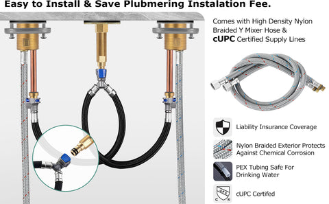 - Design to Easy Installation for Saving Plumbing Installation Fee - This 3-Piece bathroom sink faucet with rough-in valve, no more valve required to complete installation. Just join three separated pieces of faucet with "Y" shaped quick connect mixer hose and cUPC certified water supply lines.