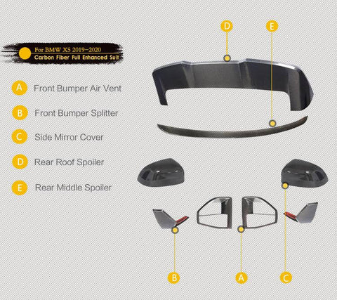 A. BMW X5 G05 M Sport Carbon Fiber Front Bumper Air Vent B. BMW X5 G05 M Sport Carbon Fiber Front Bumper Splitter C. BMW X5 G05 M Sport Carbon Fiber Side Mirror Cover D. BMW X5 G05 M Sport Carbon Fiber Rear Roof Window Spoiler E. BMW X5 G05 M Sport Carbon Fiber Rear Middle Spoiler |