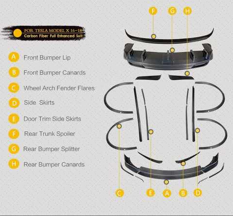 A. Tesla Model X Carbon Fiber Front Bumper Lip B. Tesla Model X Carbon Fiber Front Bumper Air Vent C. Tesla Model X Carbon Fiber Wheel Arch Fender Flares D. Tesla Model X Carbon Fiber Side Skirts E. Tesla Model X Carbon Fiber Door Fender Trims F. Tesla Model X Carbon Fiber Rear Trunk Spoiler G. Tesla Model X Carbon Fiber Rear Bumper Diffuser H. Tesla Model X Carbon Fiber Rear Bumper Air Vent |