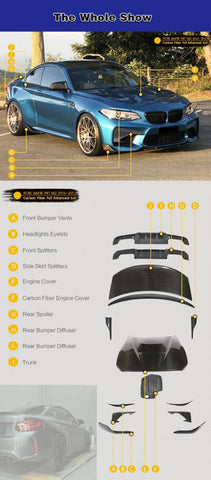A. BMW F87 M2 Carbon Fiber Front Bumper Vent B. BMW F87 M2 Carbon Fiber Front Headlight Eyebrows C. BMW F87 M2 Carbon Fiber Front Bumper Splitter D. BMW F87 M2 Carbon Fiber Side Skirts Splitter E. BMW F87 M2 Carbon Fiber Hood Cover F. BMW F87 M2 Carbon Fiber Engine Cover G. BMW F87 M2 Carbon Fiber Rear Trunk Spoiler H. BMW F87 M2 Carbon Fiber P Style Rear Bumper Diffuser I. BMW F87 M2 Carbon Fiber B Style Rear Bumper Diffuser |